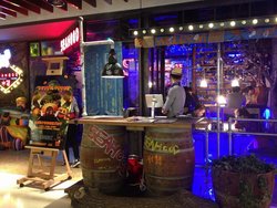 最近很火的餐厅,我们大概5点到的等了差不多10分钟号吧,吃完出来外面就排大队了。环境很有意思,装修的跟海底世界似的,光线是幽蓝的又有点夜店风,里面又分不同区域有不同的风格,音乐有点吵。服务员脑袋上都带个螃蟹帽子,上菜都说您的货来了。无餐具的概念就是手抓,当然桌子旁边抽屉里也有一次性勺子和塑料手套。我们三个人团购的两人餐又单点了些,性价比着实不高。海鲜市场:这个首先上来,一大袋子统统倒在桌子上,吃法很豪迈,但是有一半都是空壳没有肉,真是挺坑爹的。海鲜至尊烩饭:不好吃,还特别辣,放了几只虾几个壳类,还有好多土豆。。真是谈不上至尊,价格也忒贵。串烤五花肉:这个还不错,至少不难吃。洋葱塔:卖相挺好,但是对于本就吃不了什么洋葱的我来说,小小的洋葱圈更能勾起食欲,这种大洋葱圈,外皮和里面洋葱还根本没融合的东西,提不起兴趣。海盐虾姑:又是坑爹的玩意儿,我只吃了一个,上面放的都是个大的,下面的全都特别小,商家也太贼了。水货沙律:居然吃出了麻酱味儿,是想来个中西合璧弄个大拌菜么,不好吃苏打水:我们选的都是青柠的,就是苏打水味儿,还不如喝可乐呢那个猪蹄,一共三块,没有一块能咬动,还不如外面熟食那个好吃,有个薯球还不错,忘了名字。团购里那个螃蟹帽我们以为是道菜,最后才知道其实就是服务员戴的那个帽子,还就给一个。。人均110多,感觉根本没吃啥总结:环境很有创意,菜品太坑爹,性价比太低,而且商家能把做环境的心思多放点在菜上么,那些壳摆上来是干嘛的,那猪蹄都是骨头也拿来卖,把大的放上面小的放下面这种真的挺不厚道的,不管再有新意还是得货真价实啊,不然真是像这名字起的,纯粹水货了。查看更多