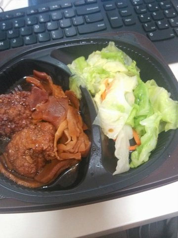 地址: 海淀区翠微路12号B1层单位加班。没饭吃。就在永和大王定的餐。送餐时间很快。十几分钟就送到了。真是够速度。红烧狮子头饭。给2个狮子头。个头不大。但是味道不错。颜色鲜亮。汤汁浓郁。拌米饭吃很不错。