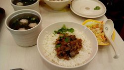 中午路过,感觉他家人不多,就顺便吃了个午饭。那天的推荐菜单是香菇卤肉饭,特价15元。要了一份,本以为只有一碗饭,没想到竟然是套餐,很划算。卤肉饭很大一碗,但也可能是价格的原因,肉不多,而且绝大多数都是肥肉,吃起来很油,幸亏是搭配的小菜,能稍微解腻。汤很大一碗,里面有肉丸和紫菜,但味精味道很浓,喝了之后口会很干。