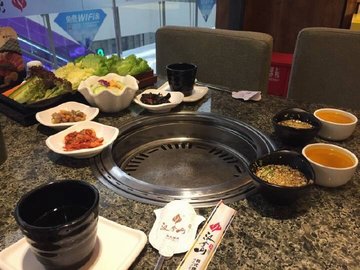 汉拿山的烤肉一直都是不错的 这里的服务也还可以热情 有免费的南瓜粥,还有自助小料和小菜很丰富的 五花肉不错肥瘦相间烤着很好吃肉质比较嫩 鸡腿肉,金针菇, 韭菜都可以烤着来吃都不错、