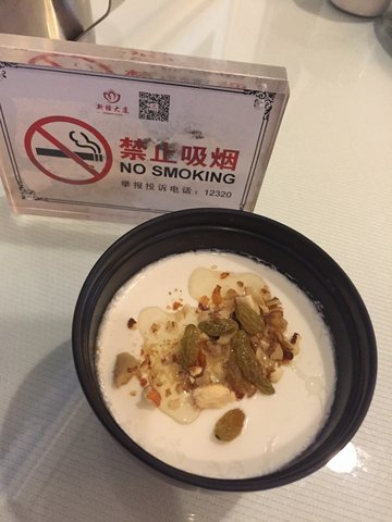 这家汗腾格里清真餐厅的地址是三里河路7号新疆驻京办事处新疆饭店一楼, 酸奶好好喝啊,点了一份12元,然后就给免费了,说是酸奶是赠送的不用点,暗自窃喜啊,哈哈~真的好好喝,上面的葡萄干和坚果特别好吃,不爱吃甜的,没有加蜂蜜,感觉酸奶很粘稠口感真不错的