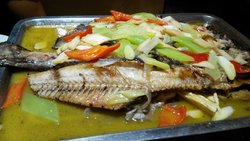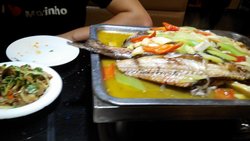 来这里肯定是冲着烤鱼来的,中午和朋友几个人点了份烤鱼,鱼是新鲜,活的草鱼,不到3斤,配菜有豆皮,青笋,金针菇,土豆片等等。又点了几份凉菜,有老醋花生,大拌菜,拍黄瓜。烤鱼要的微辣口味,很下饭;拍黄瓜一直是最爱。然后每人一碗米饭,鱼肉很新鲜,我们吃的很饱,也很解馋哦~查看更多