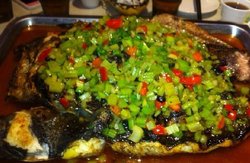 这家店位于酒仙桥路15号,他家的烤鱼口味分很多种,有香辣、麻辣、豆豉、怪味等。个人最喜欢他家的麻辣烤鱼,鱼的种类选择鲶鱼刺会少一些,但鱼的个头都比较大,最小的也有两斤半,两个女生根本不吃完。烤鱼里的配菜建议点些芦笋、豆皮等,吸油后吃起来很香。凉菜里的蕨根粉和皮蛋豆腐味道不错,皮蛋豆腐就是用一整块白玉豆腐加几块皮蛋蘸着汁吃的,挺爽口。主食推荐酸菜炒饭,炒饭的水平一般,但酸菜非常好吃,人均价格80左右,真心不便宜,建议多几个人来吃比较好点菜。