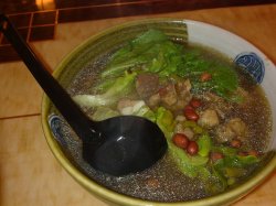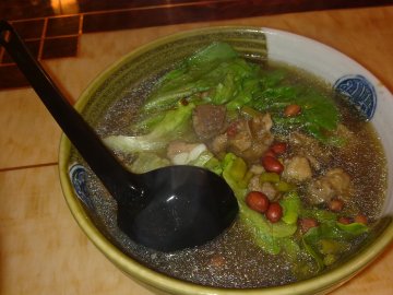 招牌好象是什么牛腩的米粉。可惜没有了。:(点的排骨的。没多久就来了,估计都是半成品准备充分的。汤一定要多加醋,因为酸酸的才治感冒!左手勺子右手筷子开工!花生其实泡了就不脆了,所以要先吃!豆角很一般啊,超市卖得好要香一点,不明白旁边的MM为什么还要加一份豆角