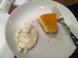 外国人蛮多的一家店,主打意大利面。每日的例汤,例面会用粉笔写在墙上,还蛮特别的。点的是它家的芒果芝士蛋糕,端上来之后芝士蛋糕旁边还放有一大坨的淡奶油。蛋糕的第一层是芒果酱做的软冻,第二层是芒果味的芝士,第三层是蛋糕底。整个蛋糕的芒果味很浓,还带有芝士的香甜味,底层的蛋糕底做得酥脆可口,旁边的那坨淡奶油起到了解甜腻的作用。搭配得很不错,味道也超好吃的。