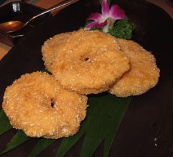 早就想去这家泰亭泰国时尚餐厅了,可惜前一段时间在停业装修,所以最近才去的。以前就吃过他家的菜,都是蛮可口,符合我们中国人的口味,估计是稍稍改良过了。金钱虾饼很值得推荐,里面吃得出虾肉哦,外面虽然不是炸得特别脆,但里面保持了鲜嫩的口感,真的很好吃。而且做成铜钱的样子,卖相也好。这次去点了个芒果鳕鱼,算是创意菜吧,芒果的清香和甜腻配合软嫩的鳕鱼肉真是相得益彰。查看更多