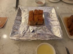 海上阿叔 真心一般平常特地探店的话,不会选择这样的店。每天路过。但从未想过要进去。因为突然之间想吃饭,所以在无数个团购中,选择了这家。近。而且不需要预约。看了评价,所以知道人均要80左右,那么我们团了两张100的,想应该没问题了吧。谁知道。居然后来还是贴了50元2楼的茶餐厅应该是新开的,所以装修的非常漂亮。而且一看就知道是很新的感觉。生意倒还不错。只不过没坐满。坐下位置,看菜,推荐菜都贵的吓死人。其实68元一道菜不算贵,但是那个量真的有点夸张诶。点了几个推荐菜,味道是还可以,但性价比确实不高。1.阿叔火焰烧肉 ★★★☆ 68元上菜的时候,盘子非常大,肉非常少,数了一下,切开来的一共才六块,而且小的一点点。上面的皮看的是烤过,脆脆的,肉也很嫩,还送了蘸酱,味道我觉得还是可以的,就是过油了一点。总体这道菜性价比不高。2.小锅生煎赞 ★★★☆ 20元5元一个,四个20元,这个价钱还是OK接受的,因为现在小杨生煎也就比这个便宜那么一点而已。喜欢他们家的皮,很脆,很好吃,但里面的肉一般般。汁不是很多。而且肉量比较少。空空的感觉。3.辣酱炒年糕赞 ★★★★ 48元他们家的价钱真是都很棘手啊……量也都比较精致的,不过味道都是还算可以,这道菜年糕还是很糯很Q很好吃,不过这种普通菜式连我妈都会,我觉得没有必要卖的那么贵,这道菜至少应该要走平民路线吧。4.芝士焗桂鱼面 ★★★★☆ 68元这道菜印象让我很深刻,因为一开始上来的时候,我就觉得是道普通的芝士面,有什么特别。还特别贵,但当吃到面的时候,才感觉到原来他把桂鱼肉做成了面的形状。所以才会叫桂鱼面。挺有特色,料也下的很足,所以喜欢。5.厚多士 ★★☆ 28元这个价格能接受,但味道实在普通,还没70后的那个厚多士好吃了,冰激凌不好吃之外,他还送了两个酱,一个是炼乳一个是蜂蜜。沾了都不好吃。不喜欢。介意大家不要去吃。总的来说服务还行,味道还行。就价格太贵了。两个人吃的这些菜,刚饱吧。248元。不值得啊。——————————————————————————贵……就一个字……End…查看更多
