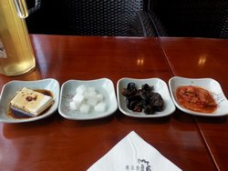 平时中午经过总是看不见多少客人。不算很大的店面。整洁的店堂,门面和天花上都有白色的花瓣图案。光亮的深灰色地板,深灰色的仿藤椅、木桌,靠墙有蓝色花的沙发椅。就是店员的形象很一般。有免费茶水。送四小碟小菜,辣豆腐、酱罗卜、酸辣木耳和辣白菜。喜欢酱罗卜一些。参鸡汤套餐与在韩国吃的不一样。我在韩国吃过的是鸡与米煮在一起,人参的量也是一整根,鸡也大些。鸡汤乳白色,没什么油,味道较为清淡,也没什么香味,带点淡淡的药材味。鸡是一整只,好小,应该是仔鸡。肉质还行,紧实,不是很柴。加的人参非常少一点。鸡中间包了糯米,较软糯。配了一碗米饭,较硬,最好泡在汤里吃。总体感觉还行,不过比在韩国吃到的要差些。