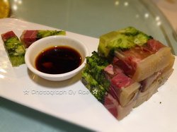 【海立阁】在仙霞路上过年的时候单位的年夜饭就是在他家吃的总体来说菜量什么的都还算不错吧他家主打的是海鲜产品大明虾、生蚝、小鲍鱼什么的,品种还比较齐全他家的内部环境算是比较普通的装修但是从墙面、地板之类的油腻程度看起来的确是有些老旧了灯光什么的也比较昏暗一点【兰花肴肉】这个菜品还挺特别的用肉冻把西兰花和肴肉组合在一起光吃肴肉会显得油腻但是同时结合西兰花的清爽荤素搭配倒是不错的创意【烧味拼盘】叉烧、油鸡和排骨的组合量明显很少,特别是油鸡和排骨才没几块不过味道倒还是不错【捞汁沙鱼肚】其实不太明白什么是沙鱼只是点菜单上是这么写的,也不知道是不是鲨鱼……这个菜品吃上去的口感脆脆的,有点像是海蜇【凉拌木耳】口感清清爽爽现在大多数的店凉菜菜品里必备木耳又健康味道又好关键是制作起来也没有什么技术含量,非常简单【蔬菜沙拉】没有什么特别的,中规中矩【刺身拼盘】大爱的刺身拼盘来了因为是单位组织,所以只拼了三文鱼和北极贝但是正好这两种是我最喜欢,正合我意刺身的色泽看上去就很新鲜,所以让人很有食欲三文鱼的切片厚度不厚不薄沾上酱油吃在嘴里的口感非常好北极贝的肉质够爽脆,有嚼劲,就是个头小了点【姜葱梭子蟹】味道咸鲜,非常不错用的梭子蟹很新鲜,所以海鲜天然的鲜味非常足烹饪的火候也恰倒好处,好吃【牛油焗龙虾】这个龙虾貌似不是一般焗龙虾所用的那种大龙虾个头比较小,量也比较小但是龙虾的肉质吃上去倒是和大龙虾差不太多牛油香气浓郁,配合下面的面条一起吃倒也还是不错【酱爆竹蛏】将蛏子肉挑出后加入酱汁单独爆炒酱香味非常浓,且完全渗入蛏子里蛏子处理的很干净,没有吃到任何泥沙味【总结】他家的生意一直都是比较好的关键是小海鲜的价格算是平价,所以大多数人都能接受小鲍鱼、生蚝之类的不会超过10元一个其他海产品的种类和做法也比较齐全喜欢海鲜的童鞋有机会可以是吃吃看