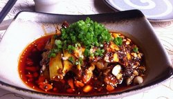 吃川菜的一家店,人气蛮旺的,吃的人不少哦按照吃川菜惯性,迫不及待先点了水煮鲶鱼,口水鸡,毛血旺这三个口水鸡有点失望,貌似是冰箱拿出来再加热的?有点温温的,吃了不舒服水煮鲶鱼一大盆啊,都是红彤彤的辣椒,让服务员拿碗把辣椒都捞掉了~鲶鱼很嫩,入口即化,而且麻辣够味,搭配着豆芽一起吃。毛血旺是最喜欢的,血很嫩,而且很烫嘴,就是喜欢酱紫的毛血旺啊其他的话,点了羊排,很不错,流油的羊排超级好吃的点了一盘蕨根粉,特辣了,实在吃不下去点了推荐的干锅牛蛙,的确不错,很脆,里面的配菜也不错,特别是土豆片,其实就是薯片了~\(≧▽≦)/~啦啦啦查看更多