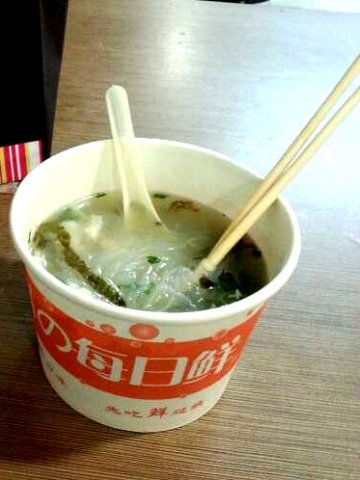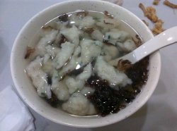 偶尔好像看到过对他家的介绍,心里记得着,于是有天去五角场的时候,特别去光顾了一下。可能是因为我去的时间非下班时间,也非节假日,他家门前竟然很是空闲,不用排队,还可以坐下来多悠悠的品尝鱼丸。温州鱼丸,和平常我们常吃的鱼丸很不一样,冬日里火锅里常吃的鱼丸,一定是圆的,但是温州鱼丸则是被捏成长天的,丸子上面还有横有楞的,样子,接近一条鱼。这样的鱼丸里,应该是没有淀粉的,鱼肉里加杂着香菜。吃起来,并不觉得很有弹性,但是却很有质感。汤底里飘着切成丝的生姜和紫菜,汤的味道有些酸,估计是加过醋了。味道上并没有感觉上特别的好吃,只是觉得是一种特色小吃而已。