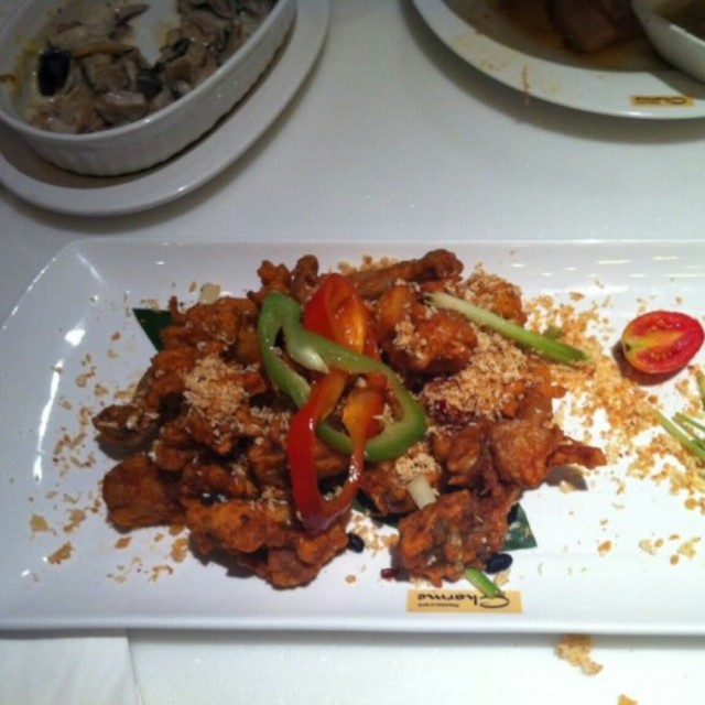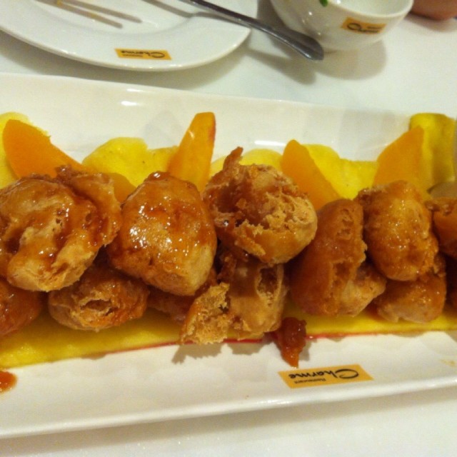 鬼马虾球和三杯鸡都是我们去港丽餐厅必点的,因为一直以来都觉得很喜欢,鬼马虾球的千岛酱汁给整体增色很多,酸酸甜甜的口味也很开胃的,最外面的油条炸的很酥脆,底下的水果裹上酱汁味道也很赞。三杯鸡和鬼马虾球走的这是不一样的路线了,它是以咸香的味道为主,鸡肉咬起来也很酥嫩,九层塔的独特调味很可口。