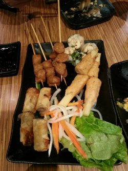 消费还可以吧 人均100不多可以吃蛮多东西了。我选的很多小食。有个什么木瓜丝鲜虾的,里面还竟然有鸡肉啊 鱿鱼什么的,性价比还行。鸡肉和鱿鱼吃起来也不老。春卷选了虾肉的,外皮脆脆的,里面除了虾肉还有黄瓜啥的,比较新颖,自己家肯定做不了那么好的:)主食点了个米粉啊,米粉是很细的那种,还有汤。我们是吃完蘸酱的米粉再喝汤的,感觉这样不错,很鲜---看到旁边有人是把米粉倒入汤中,感觉有点怪 呵呵
