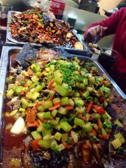 湘知湘味这家店开在广东路上,属于一家价格实惠的小饭店,因为地段的关于,所以客人还很多。他家的烤鱼不错,是用鲶鱼做的,鲶鱼不是很大,烤的时间可能有点长,外面的鱼皮都有点焦了,烤后方了洋葱、芹菜和很多香料烧制而成,鱼肉很入味,烤鱼内还放了点豆皮,豆皮吸收了鱼肉的味道后特别好吃。