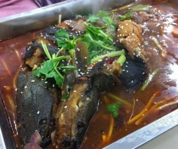 去吃的时候,是一次团购。烤鲶鱼,里面加了老豆腐。米饭,再加一扎酸梅汁。两人吃,绝对够分量了,价格非常超值。鲶鱼个头不算大,但是经过慢煮,一边煮一边吃,作料的味道倒是都漫漫渗透到鱼肉里了。鲶鱼骨头少,吃起来方便,不过就是吃到的这条不算很肥美。里面的老豆腐,切成了方片,表面已经很油亮、光洁。其实咬起来,挺嫩的,但是用筷子去夹,不像嫩豆腐那样容易碎。但也因是实心的,不容易吸油水、吸味道,所以表面那么油光发亮呢。