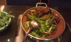 点了一份羊蝎子价格是108的~送了一份青菜。羊蝎子很大一锅,很嘬实,下面还有青笋和白萝卜的配菜,白萝卜炖的很烂了,块很大~很好夹。羊蝎子大概有三斤左右,里面还吃到了羊蹄,骨髓也很多,不过味道有点咸。服务员态度一般,我进去之后半天没人理我,我都坐了十多分钟叫服务员,服务员才来,而且上菜也比较慢大概四十分钟才上来。配菜比较贵,鸭血之类的都要22块钱,然后海鲜也都要78 98的样子~