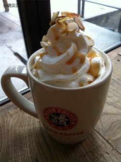之前同事在微博上看到这家,然后去找了图片来看,松饼看着很诱人,放假无聊就和朋友找去了。这家店空间很大,而且生意好好,去的时候基本上是坐满了的。吊灯都比较复古,不过感觉桌椅的混搭好奇怪啊,每张木桌旁都是摆几张木椅子,然后再混搭一张皮椅或是那种欧式的布椅。 这家的营运模式感觉和星巴克很像,都是先去买单然后自己找地方坐,也没有服务员来特意理会你。所不同的是点完单后会给你一个可爱的布娃娃,放在桌子上,然后服务员就会把点的东西给你送过来了。本来是打算喝果汁的,但是在点单的时候闻到咖啡很香,就还是点了两杯咖啡和一份松饼。焦糖玛奇朵,33元,没有可爱的拉花,而且杯子还有一个小缺口。榛果焦糖拿铁,32元,两杯咖啡端上来都没有点单时闻到的那种香味,而且都比较甜,最后都没有喝完。。水果冰淇淋松饼,38元,这个性价比很高啊,两个人吃了后直接连晚饭都省了。造型很可爱,松饼、冰淇淋、猕猴桃、草莓、香蕉、橙子,看起来很丰富。松饼很松软,很好吃。还有免费的面包条,很香脆好吃。