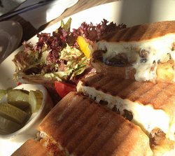 这家店就在工体北路,环境布置的挺原生态的,里面的树木看着真挺逼真的。因为是正餐,所以点了一份韩式牛肉帕尼尼,42元,中间是牛肉末,外层的面包还挺松软的,而且还搭配了蔬菜和酸黄瓜,搭配的营养很全面。查看更多