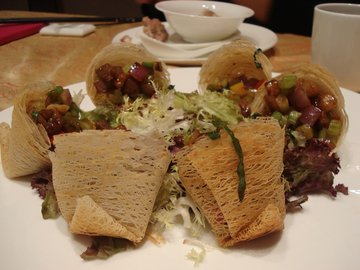 三五好友相约他们家吃个午餐,潮菜的口味嘛,大家都能吃,是聚会的不错选择。 烧鸭,皮脆肉嫩,鸭子的选材很不错,不是特别肥,但是又不会觉得鸭肉干,也不会有鸭子的腥味。 潮式蚝仔煎,蛋煎得比较透,里面蚝仔不少。 金杯雪花牛肉,造型别致的说,牛肉吵得好嫩哦,带一点点小辣,配了各色丁,口感丰富。 反沙芋头,外层裹着白糖,里面的芋头很酥很糯,深受嗜甜人士欢迎啊。 豉汁蒸盘龙鳝,摆盘漂亮,肉质鲜嫩,蒸的火候正正好好。 虾饺皇,四个一笼,澄粉做的皮晶莹剔透,每个虾饺里面都有很大的两个虾仁哦,吃得很过瘾。配了醋和辣酱可以蘸。 XO酱炒萝卜糕,XO酱自然很鲜辣,萝卜糕炸得口感嫩嫩的,微微的辣味,很好吃哦。 周末他们家生意很好,服务很环境都还不错。…查看更多
