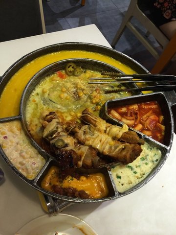 三个人去吃的环境还不错的一家火锅店 推荐芝士肋排不错做法比较独特的肋排有六块,有马苏里拉芝士搭配着 味道不错 炉子周围是南瓜粥,色拉 大酱汤很丰富的还有酱料 很好吃味道浓郁的吃到嘴里都是幸福感 金枪鱼紫菜包饭也不错