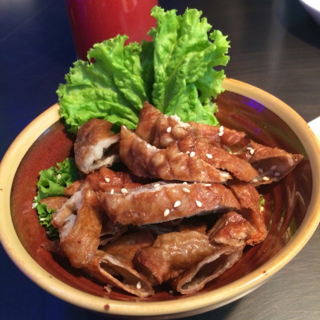 又是一家装修的像是酒吧的烤鱼店,宝石蓝色的基调,昏暗的灯光,情侣约约会吃吃烤鱼还是挺不错的。刚进去的时候觉得服务员真的是不少,坐下之后才知道原来每桌都有对应的服务员,换盘子倒水很勤快,这个是蛮人性化的。烤鱼有多少选择,和别家店不同的是,他家的烤鱼是按照份来卖的,不是按斤。看评价都说湄公鱼不错,就点了一条来尝尝,肉质果然是很嫩,刺也不多,如果本地的上海人建议点怪味的,比较符合口味,有点微微的甜,很好吃。配菜喜欢里边的千页豆腐,口感很Q,也没有豆腥味,很棒。藕饼看起来很好看,稍微有点淡,不油腻,还不错。