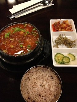 没怎么排队就进去了,环境有点闹哄哄的,不是特别好,位置也有点小,地上黏黏的。泡菜汤挺好喝的,泡菜很多,汤汁很浓,豆腐也放了蛮多的。烤五花肉还行,就是肥牛有些老啊,咬不动,五花肉挺好的肥瘦正好。南瓜粥很稀薄,没有外面的好吃。炒年糕也还行吧,总体一般。服务态度不是很好,上菜很慢,催了也没用~