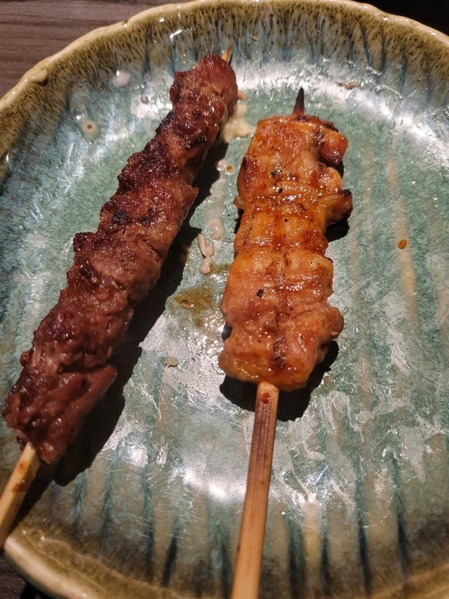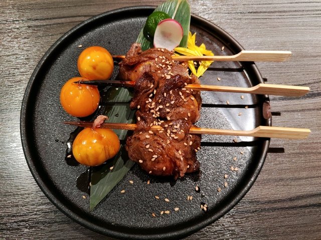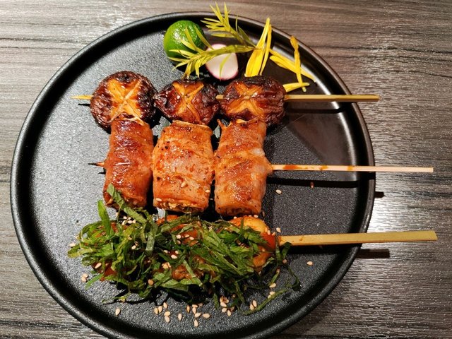 紫蘇梅子雞肉串 18元, 博多豚肉包菜卷 18元, 香菇串 18元