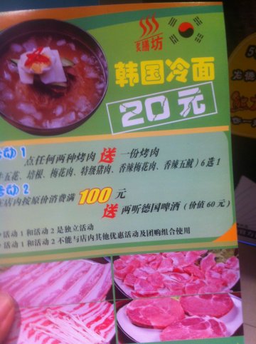 地址:立汤路186号龙德广场B1楼(近好伦哥), 天通苑。店不是很大,环境一般。团购的双人餐,118元,包括牛五花,五花肉,烤鲅鱼,鸡蛋羹,土豆地瓜拼盘,滋补解酒汤,两碗米饭。五花肉,肥瘦适中,很好熟,不腻人。还会免费赠送小凉菜,生菜等,比较实惠。