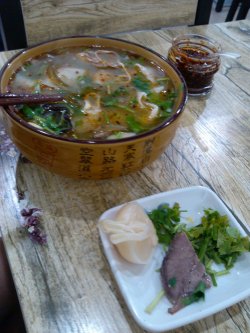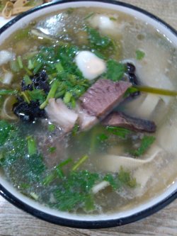 餐厅: 烩面王 地址: 西城区旧鼓楼大街181号点评:这家饭店以前来过,烩面很棒,这回来突然发现他们家有道很独特的凉菜,而且都是蒸出来做的,比如蒸马齿笕,就是一种野菜,听大厨说这蒸菜是他们河南的特色,上面调了大蒜汁,吃着面面的口感,但也能感到菜是根根分明的,个人不太喜欢,可能是吃不惯。河南烩面,他们的面条很宽也很薄,里面的料依然给得很足,有豆腐丝,有木耳,有小鸡蛋,有羊肉,汤很浓,闻着羊肉味儿足,这绝对是原汤熬制的,好喝。面条更不必说,软且弹牙,天气转凉了,来这一碗烩面,吃着舒服啊。…查看更多