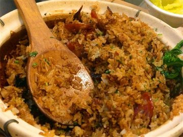这个上来是一个砂锅,里边放置着炖好的鸡,像是柴鸡,肉质很紧实。味道有些甜,因为现场打开椰子把椰汁放进去,吃法很新鲜,沾着小料味道还行,就是难啃。价格偏高,格调适合情调小聚。