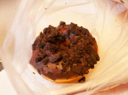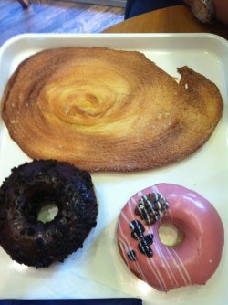 第一次看到的时候有点被吓到的感觉,还是比较大额一个甜甜圈呢!可以买一只也可以买一半 ,我买的时候是有折扣,不过还是觉得有点小贵!不够真的好吃!特别是外面一层酥酥的皮,里面松软,夹着巧克力,巧克力甜腻腻的,浓情!应该是烘培的很有火候,近乎直径20厘米的大甜甜圈,诱惑无比。查看更多