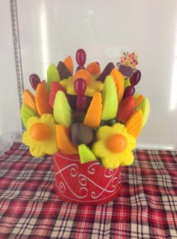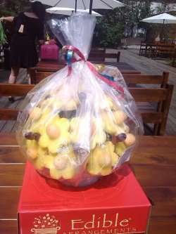 这家店是北京开的第一家。是用新鲜水果做出各种花的造型。做为聚会或者庆生的礼物也是很不错的。水果的造型各式各样,全都很新鲜也很甜。草莓上面裹了巧克力。菠萝造型的花,中间部分很硬嚼不动,中间的就扔了。哈蜜瓜也很甜。下面的容器很精致,是瓷的,吃完水果后可以当花盆用。价格有点贵,要比一般蛋糕或者一束花贵一点。不过很值,看到成品后让人心情大好。查看更多