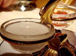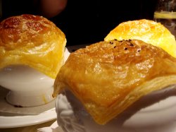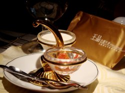 当我看到第一位身穿燕尾服的店员时,我还以为他是弹钢琴的音乐家。嗯,环境相当不错。回廊式的设计,卡座比较私密,一边临窗貌似可以看风景,一边在墙壁上都是镜子的设计,让空间变得更大更明亮。碰着刀叉盘碟都尽量不发出声音以免显得粗鲁所以得小心翼翼,而貌似就近邻座邻邻座的谈话都貌似可以隐约听得到,店员服务很周到也很到位,也是显得小心翼翼。窃以为,这样优雅的环境,水晶吊灯,皇室而气派的餐具,穿着正装的店员,如果配上一些入门式轻快的古典音乐或者慵懒的jazz,会让气氛变得更加浪漫而富有情调,而且顾客也不怕发出声音嘛,哈哈。如果能配上live music,更加好。呵呵。同样很幸运的,serve我们的是张先生,彬彬有礼,热情周到,很赞的服务!真是象王品口号那样“只款待心中最重要的人”!先上的现烤面包,番茄酱不很有特色,鳕鱼酱略显不够浓稠。但是卖相一流!我的鹅肝沙拉,很赞的一道珍品。鹅肝外酥内软,入口即化,鹅肝的香浓和馥郁环绕着舌头渗透每个味蕾。就连配菜红酒浸雪梨都吸收了鹅肝的清香。视觉和味觉上都得到双重享受了!呵呵。酥皮海鲜清汤。清汤用料足,味道鲜美。酥皮是张生用纯熟的刀法帮忙切开的,我还是把他们浸到汤中,居然在酥皮中尝出了椰蓉味道~~这种浓郁的味道和清汤的淡淡清鲜混合一起,很不错。我的main course,红酒羊排。羊排是很嫩的小羊吧,没有骚味,红酒汁也很浓郁。酸梅沙冰,解腻,正好。酸酸甜甜。我的香橙拿铁,喝的时候已经不够热了,因为我在等我的芝士蛋糕,呵呵。覆盆子芝士蛋糕,又一道精品,连个饼底都用心去做了,芝士味很浓。查看更多