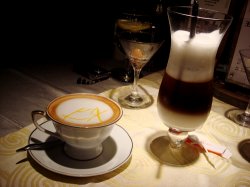 终于写到饮品喇,,天吖,,我好眼训吖,,左边系Kenxin既橙意拿铁,,据当事人描述,,无咩咖啡味,,得个样得意,,右边系小福既冰Cappuccino,,由于当事人赶时间要走了,,所以无详细介绍味道..再黎就系Daisy既经典咖啡,,我听到距点餐既时候问个哥哥,,"边只咖啡味道最浓?"..张哥哥介绍系呢款...我谂,,经典,,应该就系距既特色了,,继续继续,,小敏既香颂玫瑰露..由于点餐既时候已经听小福描述距既造型,,所以已经有左底了..但距上黎既时候我都系有少少吓到了,,D冰既制作好精致吖,,劲爱,,可以见到D玫瑰花架..而且酸酸地,,几好饮吖..好香既玫瑰味道,,好正,,最后就系肥猫既冰滴咖啡..如果话小敏既玫瑰露系温暖既粉红色,,甘呢份就应该系好酷既黑白配了,,距一上黎既时候,,我就觉得好似人地D实验室搞科研甘样了,,有咖啡制成既冰粒..有鲜奶,,有果糖,,当然仲有斋啡喇,,总之就系一套配比你,,任你玩,,哈哈..查看更多