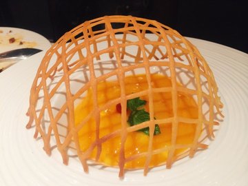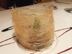 接下来是重点哦~~~甜品是焦糖抹茶羊羹~~~造型很奇特呢,外面这层乱乱的,纱帐样子的东西是焦糖,不知道这是怎么弄出来的,哈哈,中间是一个抹茶冰淇淋球球,很香浓的冰淇淋哦,最下面据说是羊羹,但是我木有尝出来哇~~~
