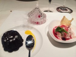 外部装修风格简洁明快,不奢华,很务实。前台服务生带冒上了电梯,领位至二楼包间。附环境随拍~这次试吃的队员只认识JIAJIA,声音甜美的妹纸一枚,这次终于见到真身啦,开森~店长给在场的小伙伴介绍餐点,推荐大家选择更适合自己的口味。服务态度佳,赞一下。每客338外加15%服务费,价格偏上。餐厅柠檬水,用餐过程中会随时添加。开胃酒,蜜桃含酒精甜酒,哇,绝对是冒的菜,冰凉爽口,淡淡的水果香。上餐速度还是很符合时宜的,餐前面包先来~面包佐银鳕鱼酱与意式番茄丁提前准备了湿纸巾,面包块是可以手取的,烤制酥脆的面包配上酸甜微咸的银鳕鱼酱和一丢丢番茄丁,虽然只是小点,入口之后给人一种即将大快朵颐的美妙感受~潜台词:连餐前面包都这么好次,其他的还用说么,哇咔咔~法式香煎鹅肝沙拉因为鹅肝酱对冒造成了阴影,这种煎制的鹅肝简直是打破了之前对鹅肝一口入口即化两口无牵无挂的印象•••鹅肝煎制之后配红酒醋酱汁,酸甜的口味完全解除了油腻感,鹅肝细腻绵软,烤苹果酸甜开胃。酥皮海鲜清汤小狮子造型好Q啊,一端上来就有浓郁的黄油香。撕开起酥皮,海鲜的味道也忍不住跑出来。汤底非常清澈,可见食材是处理得当的。虾已经去除了虾身的外皮,连虾线也都处理好了。贝类、鱿鱼、带子等食材也都保留了海鲜的原味,很清爽,没有腥味。汤味道鲜美,配起酥皮一起吃,相得益彰。主餐:陆陆大餐,台塑牛排&小羊排台塑牛排,用餐刀随意一切就可以顺利切开,明显看到肉肉和筋络的纹理,空口品尝,有淡淡的黑胡椒味道和牛肉本身的香气,配上松露酱,肉的口感更能上升一个层次。劲道,弹牙,扎实,但非常易咀嚼,这才是真正的好牛排,不管大块小块都易入口。配菜红薯块经过腌渍,甜甜的很绵软。小羊排,七分熟切开之后截面呈可爱的粉红色,外层的肉比较紧实,里面的肉因为半生,显得格外鲜嫩多汁。不吃草只喝奶的羊果然不太一样咩~本身对羊肉无爱的冒,也忍不住光盘了呢。配柠檬水解腻去膻,不过真心觉得直接食用也米有问题,辣个酱汁可以多一点点就好啦。这次为大家提供的红酒是圣路易,218元一瓶。法国干红,沃克吕兹地区,柔软的樱桃风味,带有果香,易于入口。果然是和菜单上介绍的一样,淡淡的果香很宜人,配红肉吃起来绝对是真爱的存在。酸梅冰沙,酸甜很开胃,可以随时来一勺去除油腻感。热浓浆巧克力拉瓦甜品作为西餐的压轴,想必都是为了给食客一个美好的ENDING吧。冒选的这道伴随着一阵烟雾就上桌了。器皿里放置了玫瑰花瓣和干冰,带给大家的绝对是视觉享受。草莓冰淇淋口感清爽,奶香浓郁,有果肉在里面,小女生的最爱。拉瓦用勺子挖一下,有浓浆流出来,因为热度不够,浓浆稍有些凝固,但丝毫不影响黑巧克力浓郁细腻的口感。稍有些甜,搭配咖啡食用刚刚好。热卡布奇诺咖啡。浓郁的肉桂粉香气扑鼻而来,咖啡温度适宜,奶泡浓郁,口感甜中带苦,晚上喝不会担心睡不好吧。店长刘女士赠送的卡片,可直接电话预定。餐毕还填写了意见卡,一直改进的店才是好店。附几张小伙伴餐点的图片~台塑牛排,炒鸡大块有木有,完全震撼到了,不过这款油花较多,更适合男士吧。香芒轻乳芭菲,饼干外层很有趣,想必口感也是极好的。芝麻冰淇淋佐椰香奶酪,芝麻冰淇淋很少见,外层的糖丝摆盘也好美腻~妹纸为了让大家尽情拍照,冰淇淋都融化了呢,赞一下。香颂玫瑰露。这货绝对是在凹造型啊,哇咔咔,好漂亮咩~冰块也是用玫瑰水冻制的,完全保持口感。高大上果然是高大上,15%的服务费还是物有所值的。享受美食的同时享受了优质服务,心情愉快,胃口自然大开。最后感谢点评TV,王品TV,带队的源源妞和所有新结识的小伙伴。…查看更多