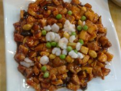 王朝大酒店的大厅看起来富丽堂皇,旁边类似皇宫的沙发和摆设虽然用一米线拦了起来,但在灯光照耀下还是星光熠熠,大厅里的钢琴看起来蛮不错的,他家的环境格外的宽敞,地砖又亮有干净,真有“王朝”的气派吖!点了八宝辣酱炒年糕,量还可以,配有公用勺子,里面的年糕外表看起来像茭白,但实际上是茭白,吃在嘴里又糯又香,味道也不是很辣,非常好吃。口水鸡里的芝麻和辣油放的比较多,鸡肉比较嫩,麻味大于辣味,味道一般般查看更多