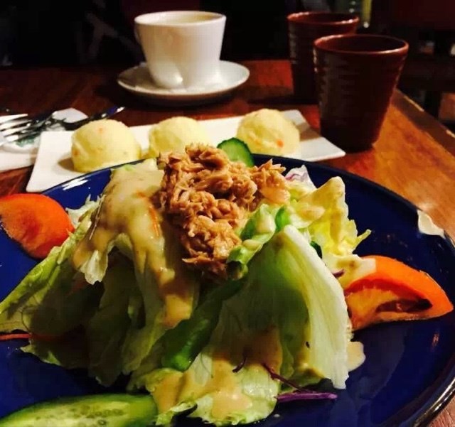 还算比较有特色的简餐店,环境还算不错的,那时候人不多还挑到了个好位子,来这里吃饭的上班族蛮多的,灯光坏境什么的也是自己比较喜欢的。他家的东西价格不贵,里面的服务员都是阿姨妈妈,态度一般般,没有很热情。厕所比较简陋,不是很干净,是男女共用的。土豆色拉,貌似很有人气,色拉里面加入了洋葱,味道偏甜。烤鸡翅一盘4个,爱尔良的味道,中规中矩,鸡翅很嫩。蛋包饭,外面包的蛋皮还是挺厚的,还不错。