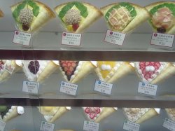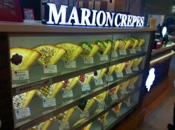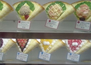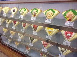 啊拉,很好吃的一家可丽饼。 店在久光地下一层,很好找,因为他家把所有能做的可丽饼都做成了模型摆在橱窗里了。一大橱窗花花绿绿看着特别诱人。 饼摊的很薄很软,配上好吃的馅,味道一级棒!最喜欢他家鲜奶香蕉的了,一整个吃进去可以顶一顿饭了。但是吃多的话也会觉得有点腻。