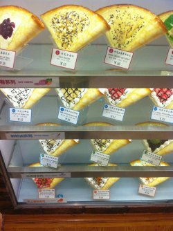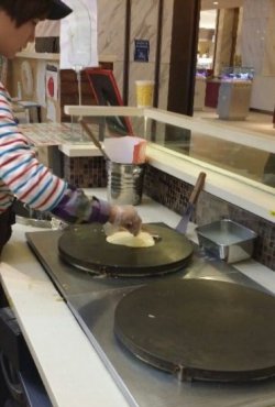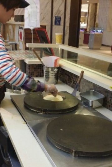 可丽饼这个名字听起来挺洋气,其实就是煎饼果子嘛,哈哈,和小伙伴们围观了一下制作过程,完全就是煎饼果子的做法,店里的电视放着介绍,说是法国的,不过店长是个日本大叔哦,汉语说的相当不错,我一开始还以为是带着南方口音呢咔咔。可丽饼种类很多,有甜有咸的,买了个巧克力香蕉的分食了,甜甜的,煎饼的饼底还是和中国的不一样,比较的细腻吧,也容易入口一些,巧克力酱很甜。就是小妹们摊煎饼的速率还不够快,多练习啊哈哈,需要开票到收银台去交款,略费劲。