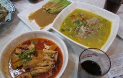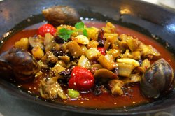 麻酱油麦菜,一份量不小,油麦菜清绿,麻酱比较浓稠,吃口香浓可惜油麦菜的品质有些层次不齐,个别的稍嫌有点苦涩冰心木瓜,半只木瓜组成,看起来有点生,尝了一口不错啊,木瓜清甜陷奶香十足留香嫩蚕豆,酥酥的也比较入味,下酒菜麻辣回味鸡,端上桌红红的一片,实则不辣,做法和钵钵鸡相似不过是热菜,鸡肉鲜嫩入味,配料中花生酱放了不少,喜欢哒~酸汤肥牛,金黄的一片,表层的肥牛数量不少,品质也还不错,好吃麻辣法国蜗牛,咋看下来除了三个大的蜗牛壳,怎么都是藕丁呢仔细翻翻,其实蜗牛不少,肉质紧实有弹性,味道不错辅料的藕丁香脆入味也很好吃,总体比较辣的一道菜,很开胃球溪鲶鱼,挺名字就知道是道招牌菜,份量十足,三个人吃足够了区别于别家的鱼片做法,这里切成了粗的条状,肉质鲜嫩,香辣入味配的年糕也很可口,香糯却又味道十足,比较重口味的一道菜玉米金瓜骨头煲,整桌菜中唯一的一个败笔,汤头金黄色可除了咸味别无其他,里面的骨头像是被啃过一样,没有一丁点肉不过汤里玉米不少,而且选用的清甜的水果玉米,我啃了好几只服务态度也挺好的,基本有求必应,值得一提的是,这段时间吃饭以来,没服务员主动换过骨盘,这点值得表扬小店环境比较简单,挺合适三五好友或者附近的居民查看更多