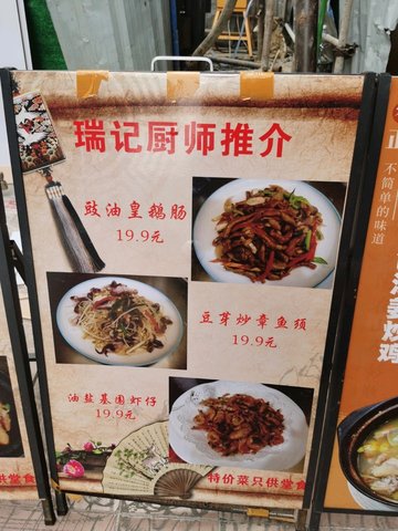 瑞记湛江鸡饭店的招牌很大,远处都能看到,环境是一般般,服务态度不够积极,啥都要自己动手,湛江白切鸡的鸡肉结实,鸡味很浓,沾着蘸料吃,肉质鲜嫩细滑,鸡皮更香更滑,白灼沙虫的沙虫洗得不是很干净,还有一点点沙,味道鲜甜,白切莲藕里面是花生,没有之前有绿豆的好吃,莲藕是粉的,蒜蓉番薯叶叶嫩蒜香味甘,清淡又健康。