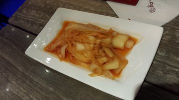 在港汇难得有一家二十元左右可以吃一顿饭的地方。原来瓯读ou,是温州的简称。店面不大。中间的吧台位闪着蓝色的荧光,上面是船样的灯箱。后面的墙上是一幅很有意思的风情画。灯光较为暗,深色的桌椅。做的是温州美食,品种不少,小吃、面、饭、小菜都有。价格不算贵。大肠面:面可选手擀、细面和粉干。碗看着挺大的,实际量没想象中的多。汤头中加了青菜,挺辣的。大肠是卤过的,不像上海的浓油赤酱,带着点粉红色。咬起来脆脆弹弹的,没什么腥味,辣辣的挺有味。面条较为滑弹,有点软。陶灶粉干:想吃灯盏糕却没有。说是用陶灶炒出来。粉干其实就是细的米粉,很弹滑。里面加了些虾干、鳗鱼干,鳗鱼干有些硬和咸,整个吃起来有些海鲜的咸鲜味。免费的茶是红枣茶,还不错,枣味很浓。总体感觉还可以。…查看更多