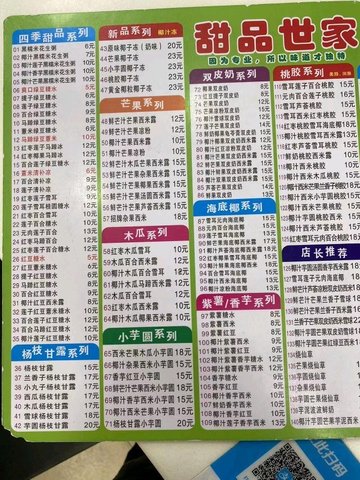 椰汁雜果西米 / 芒果牛奶冰 / 楊枝甘露 / 紅豆沙 / 紅豆沙湯圓 / 冰糖燉雪梨