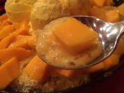 微博中奖的节奏,赶在凯莱赛最后拆掉的几天来凑个热闹,事实证明人确实是炒鸡多啊。随便一个小吃摊位都要排长队,心心念念的大x烧和王老爹焖子人最多了,果断放弃直奔甜甜向上。好吧,也是满座,等餐等了半个小时的节奏。芒果慕雪甜甜冰,48米。因为店家说芒果的比较容易做,就供应这款了。看卖相炒鸡有爱,冰上洒满了酱料和大块的芒果肉,四个芒果口味的冰淇淋球上点缀两颗樱桃,和图片无差别。比脸还大的一份,四个小伙伴吃还差不多,俩人完全HOLD不住啊。冰淇淋口感很柔滑,有果肉在里面,不过吃多了会有点腻。芒果很甜美,光是吃果肉就能吃饱的节奏。缺点是冰太硬了,都是颗粒状的需要嚼碎,更喜欢绵绵冰或者碎冰。可能这款是怕太快融化的原因吧。…查看更多
