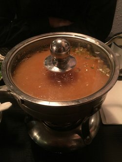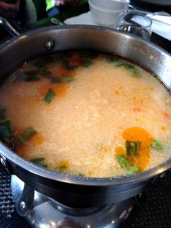 大丸百货商场的后边,地方还是很好找的,这一块基本都是美食,眼花缭乱不知道选哪家,最后才决定去吃泰国菜。据说是新装修过的,没装修之前我居然都不知道有那么火的一家店,门面我很喜欢,颜色深沉不张扬,有二层,一楼是吧台,二楼是用餐区,墙面上贴的都是泰国电影的海报和明星,照片处理的很复古,虽然人物我一个也不认识,但是觉得还蛮有情调的。我们去的还是比较早的,期间服务员时不时拿留位的牌子在桌子上摆,可见他家的生意好到什么地步了,如果上班时间想去并且时间比较晚的话,建议打个电话预约一下。【椰汁西米糕】作为甜品先上来的,很小的4块,看起来晶莹剔透,味道很清爽,做法也是在传统的西米糕里边加入了玉米,第一次吃到这样的,感觉很新奇,但是还是喜欢传统的里边都是西米的感觉。【虾饼】样子很好看,有点像面包圈,配上必备的甜辣酱,一口咬下去外酥里嫩,虾肉QQ的,很新鲜有弹性,可以看到一个个的虾仁,味道很不错。【青柠边炉】就是小火锅,锅底是冬阴功汤,酸酸辣辣辣的,冬天吃很适合,吃完一锅下去身上就很暖和。配菜很多,有海鲜,蘑菇蔬菜,还有一些肉,刚开始的辣的很舒服,越煮就就越咸,所以要尽快吃。查看更多