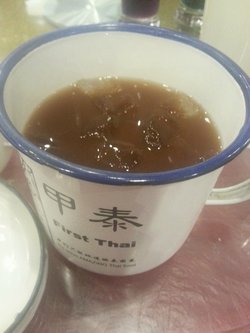 辣妈的第一站就是前往位于宁波路51号(近江西中路)“甲泰”餐厅品尝泰国菜。门面古色古香的木雕装饰很有泰国情调。英语翻译的店名“firstthai”是不是寓意泰国餐馆中名列榜首的意思呀?辣妈手里有点评网年会发的50元现金抵用卷,可以说这顿大餐对于胃口小的辣妈来说是免费的啦。一进门的前台墙上也是精美的泰国民族特色雕刻,台上也摆了佛像和小沙弥的摆设很有异国情调的说。前台旁边是泰国特色食品展示架子,架子上的货物可以买回去慢慢品尝的说。在食品架上我看到了这张“性价比最高餐厅”的奖状,看来辣妈吃饭是来对地方了。餐厅设2楼,一楼的楼梯口也是一道靓丽的风景线。左边是在波光粼粼的水池和莲花映衬下的佛像,是不是很有佛教之国的感觉呀。右边的楼梯墙上大小不一的各色照片也是一道亮丽的风景线。中间的幕帘是用麻绳做的很有返璞归真的感觉呢。可爱的小象布偶更是平添了几分可爱的异国情调。2楼餐厅的门口,也是可爱的大象!这家店的装修风格还是非常统一的说。餐厅墙上的装饰也是泰国风情的主题。整个餐厅看起来简洁明快,这是11点45分拍的照片有很多空位子,没想到超过12点人一下子都爆满的说。看来这家店人气很旺哦!洗手间的水盆用陶器装饰也是古朴典雅的主题呢。女士洗手间门口的泰国妇女壁画看着好有特色。餐具也是陶制器皿看着依然是古朴的样子。可乐是28元的上午午餐之一。其实店里给了矿泉水所以可乐被辣妈带走在游乐场喝了。椰汁西米露20元。是店里的招牌产品,冰冰的口感有点像冰淇淋。可惜量太少,再来四个就过瘾啦!包裹在棕榈叶里面精致的甜点。量不多真心的好吃所以全部吃光光啦!金边粉28元上午套餐的主打产品。也是店里的招牌菜!酸酸辣辣的口感是泰国菜的特色,金边粉独特的韧性(比西安凉皮人性高),宽度在河粉和粉丝之间。料也用得很足:鱿鱼、鸡蛋、虾仁、豆腐干绿豆芽、韭菜,所以非常有特色强烈推荐!金边粉里的虾仁大特写这份商务套餐量真心地大!辣妈有一半没有吃掉,于是本着“光盘”的原则打包带回去当晚饭继续吃!这么好吃的东西浪费了真是可惜呢!连同饮料一起打包,这顿50元的午餐吃得真是超值啊!查看更多