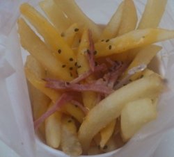 生活时尚介绍过,所以经过的时候慕名去捧了一下场。薯条不便宜,最便宜的也要10元一份。是用小纸碗装的。招牌的芝士味道要15元。薯条味道还行比较粗,外面也脆脆的。芝士酱料味道不是很浓,个人还是喜欢原味的。反正觉得薯条这价钱有点贵。查看更多