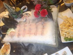 他家的主打特色是斑鱼火锅。锅底用的是一人一份那种小火锅,有鸡肉清汤、番茄汤等多种供选。小料种类也不少,特色是百度鱼酱,很不错,就是偏咸了点。鱼、肉皆有平价的和稍微高端的。值得一提的是,他家的上菜速度还蛮快的,一会儿就上来了。菜品的品相让人大大吃惊,鱼是片好后摆在一个垒着冰的木船上的,还放了些干冰作云雾缭绕仙境状,感觉不错,鱼的各个部位都分别摆好,并介绍涮食需要的时间,还特意留出几片供生食。他家服务员全程都很热心并很有素养地服务。