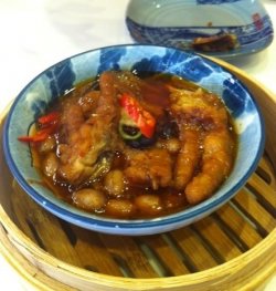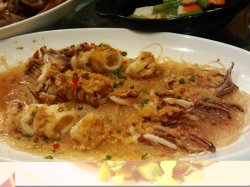 眉州东坡小吃的招牌有个东坡肘子,这个做的蛮不错的,性价比也高,很大的一块,骨头都是很工整的,外面的皮挺粘的,和肉挺容易切开的,里面的肉很嫩滑,酱汁不算很多,不过有点小辣,加了点辣椒油的。蒜蓉粉丝蒸鲜鱿也不错,蒜蓉不算配料而已,拿来捞饭挺不错的,鱿鱼的肉挺爽脆的。查看更多